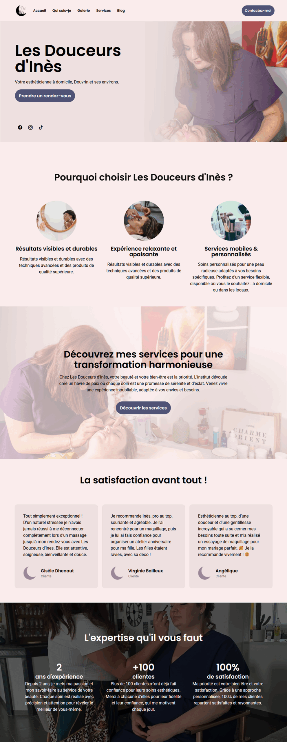 Le site permet aux clientes de découvrir ses soins, prendre rendez-vous facilement et entrer dans son univers apaisant, tout en assurant une navigation fluide, moderne et adaptée à tous les supports. Optimisé pour le SEO, il renforce la visibilité de son institut et attire une nouvelle clientèle locale à la recherche de moments de détente et de beauté.